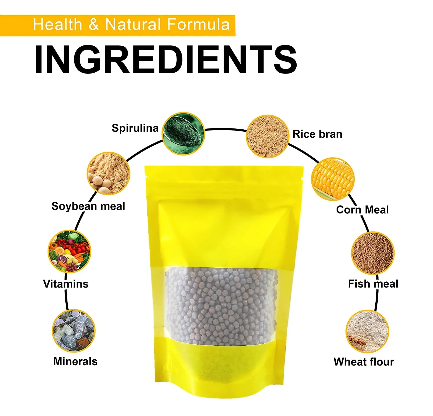 Fish meal, soybean meal, wheat flour, corn gluten, vitamins (A, D3, E, C), trace minerals, spirulina, natural binders.