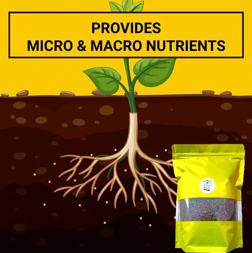 Neem Powder is made by crushing dried neem seed kernels (neem cake) into a fine powder. It contains azadirachtin, a potent natural compound that acts as an insect repellent and growth regulator. It also contains vital nutrients like NPK (Nitrogen, Phosphorus, Potassium) and micro-nutrients beneficial for plant growth.